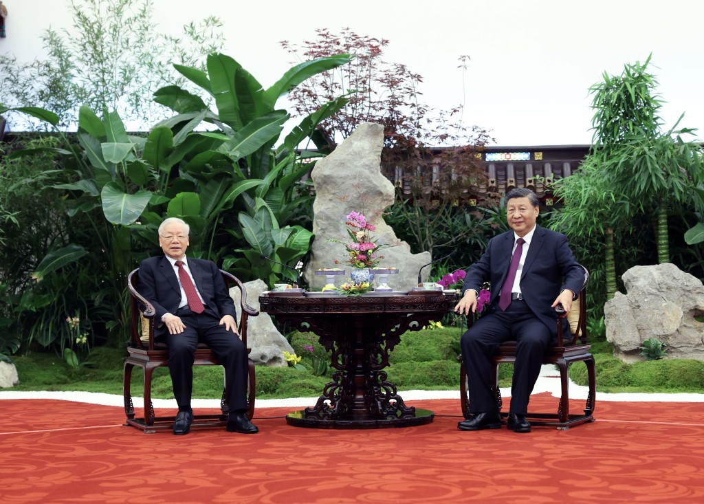 ▲習近平同阮富仲茶敘。新華社