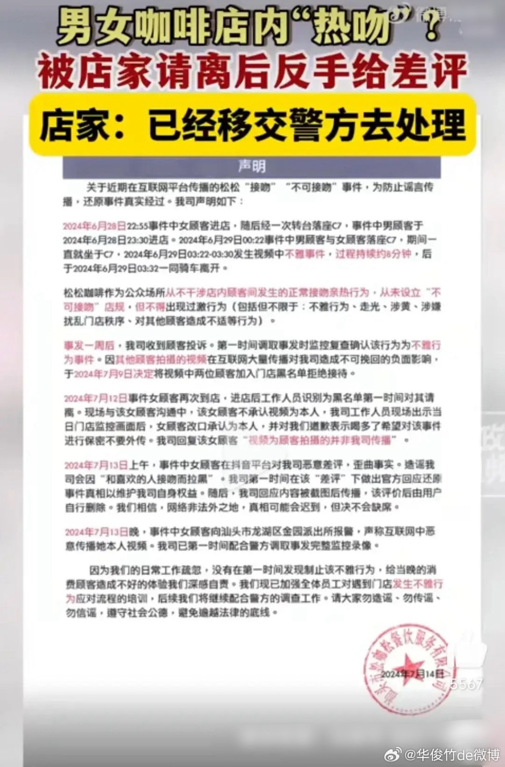 廣東汕頭有咖啡店驅趕激情熱吻顧客后,被女事主在網上留下差評,揚言要店家后悔,引發雙方在網上罵戰,令事件在近日發酵曝光,更驚動警方介入。