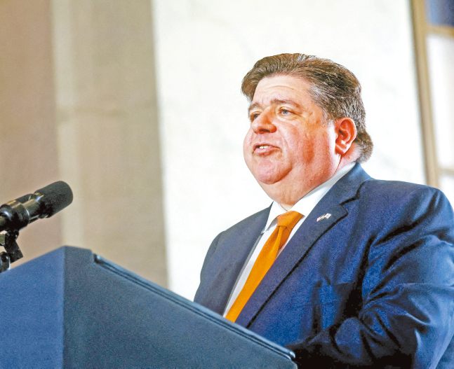 ▲伊利諾州州長普瑞茨克去年中在拜登來訪時發表演講。今天,伊州長的動向成關注點之一。 資料圖片路透社