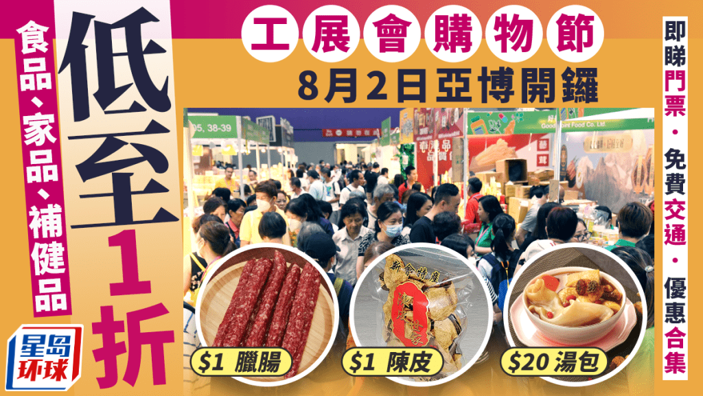 工展會購物節2024 來了!今年工展會購物節繼續在亞洲國際博覽館舉行,8月2日開幕,一連四天展出超過250個攤位,大量食品、保健品、家品等更以低至1折發售。即睇門票、優惠、交通及免費車詳情!