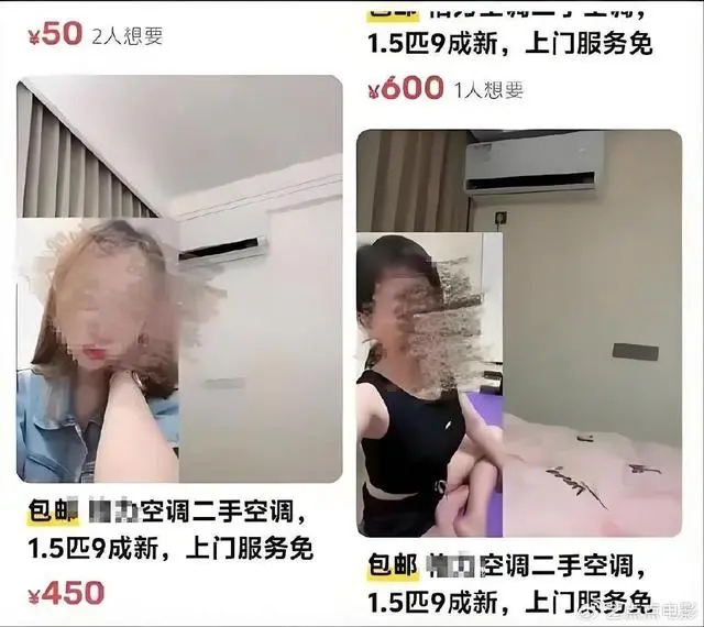 據網民發布圖片顯示,在閑魚商家出售空調的頁面上,圖片背景為掛在墻上的空調,左下角有不同的美女照片,而在價格界面,顯示50元至600元(人民幣,下同)不等。另一張圖片中,當雙方談到“成色”時,對方發來一張穿著黑色背心的自拍照。咨詢后發現實為色情服務,500元一次,2000元包夜,可加微信。