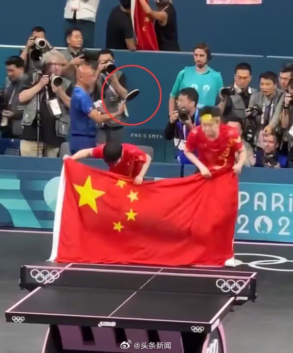 王與孫在賽事結束后在場內舉起國旗時,一批在其身后拍攝的記者疑為沖前上進行采訪,意外踩斷王楚欽的球拍。