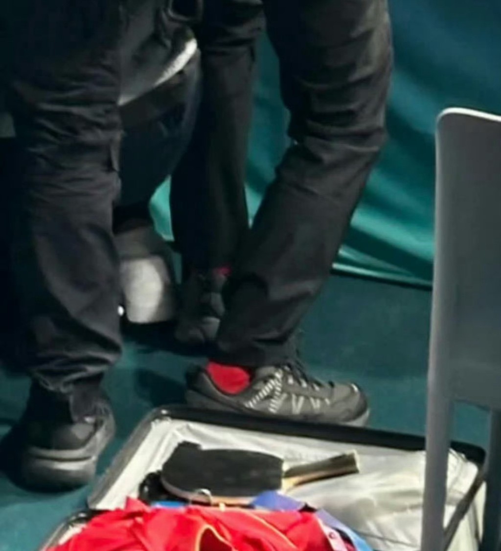 網傳相片見王楚欽的球拍上有清晰鞋印。