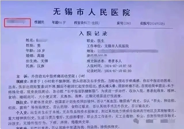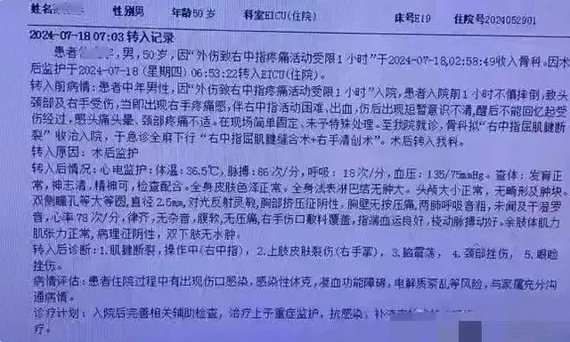 湖南《瀟湘晨報》表示,由網友貼出的病例顯示,一名傷者7月18日凌晨3點入住該院骨科,病例記載:患者于1小時前不慎摔倒,致頭頸部及右手受傷,當即出現右手痛感,伴右中指活動困難出血,傷后出現短暫意識不清,醒后不能回憶起受傷經過,感頭痛頭暈、頸部疼痛不適。