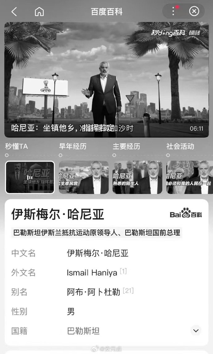 然而,哈尼亞的簡介以黑白模式呈現,引起部分中國網友的質疑。有人表示,“百度真孝啊”、“如喪考妣”、“這是披麻戴孝嗎”、“哄堂大孝”、“他啥時候成了中國人民的老朋友了?”、“他可是去年10月7日殺害多名中國人的兇手啊”。也有人說,“他是不是來北京簽宣言了?如果有來,哀悼一下倒無妨”。