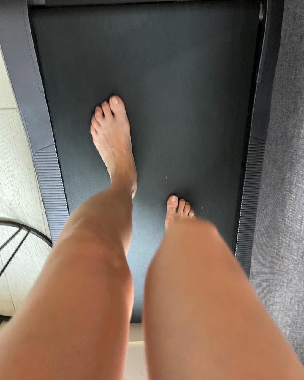 ▲關寶慧赤腳在跑步機上跑步,看起來好危險。
