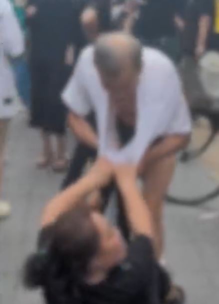 遼寧有老翁被大媽死拉不放,被逼當街剝剩底底才能脫身。2