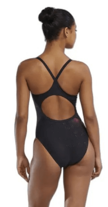 FINA認可的Speedo Flexex女士Comfocut連身泳衣 $1,299,較高的領口設計有助減少水的滲入,而背部的Cut Out設計及寬肩帶則可減少勒痕感。