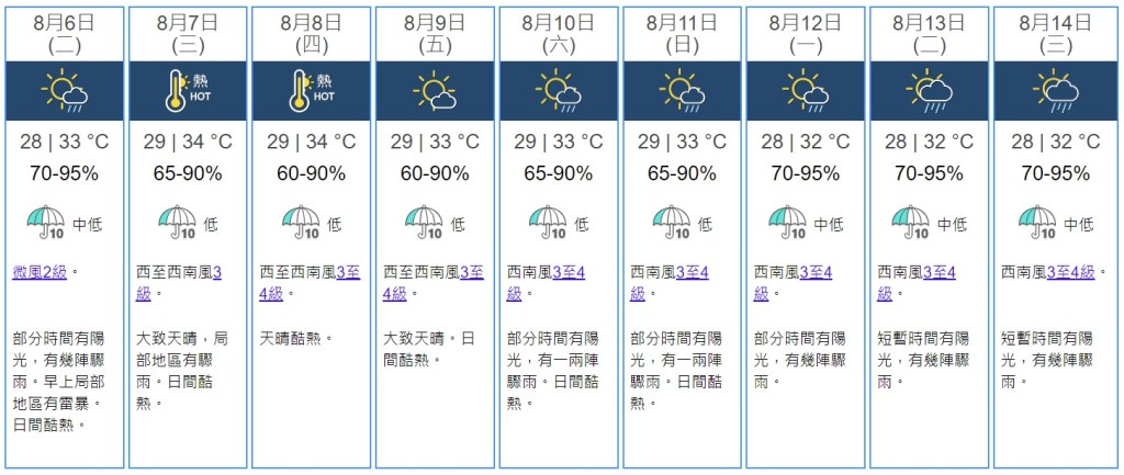 香港天文臺預測,立秋當日(8月7日)及隨后幾日天氣(資料來源:香港天文臺)