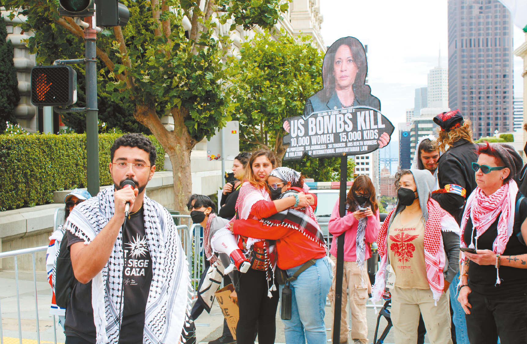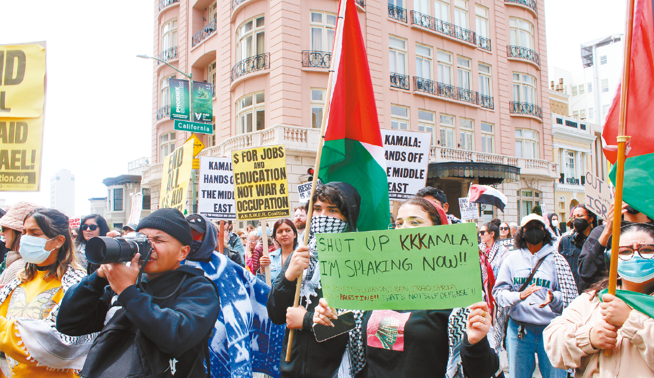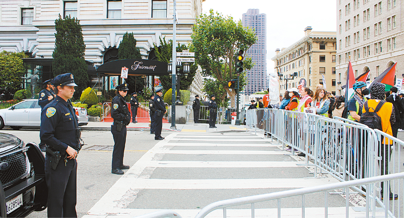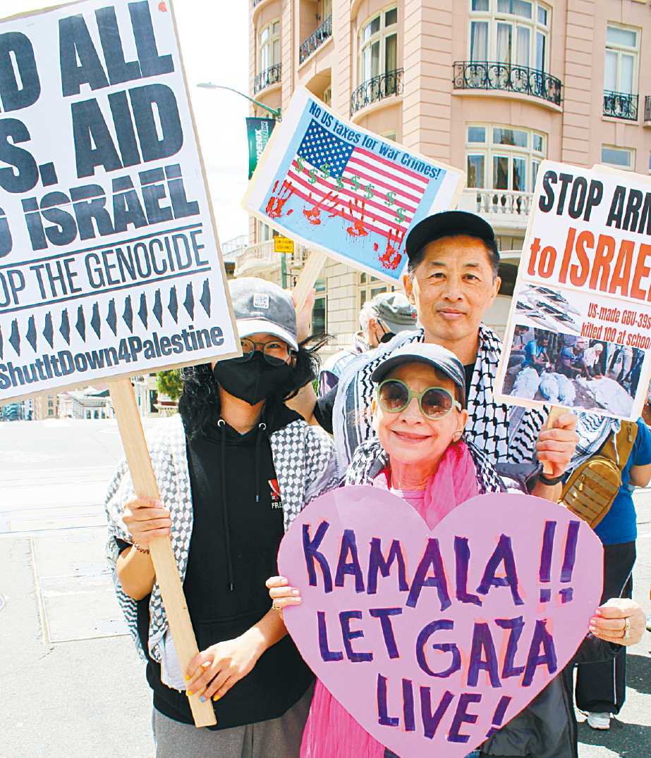 民主黨總統候選人、副總統哈里斯周六(10日)晚抵達舊金山,周日(11日)在諾布山(Nob Hill)費爾蒙特酒店(Fairmont Hotel)舉行籌款活動。百余名支持巴勒斯坦的民眾聚集在酒店外和平示威,要求哈里斯行使副總統的權力終止軍援以色列,停止種族滅絕,否則將不會為她投票。