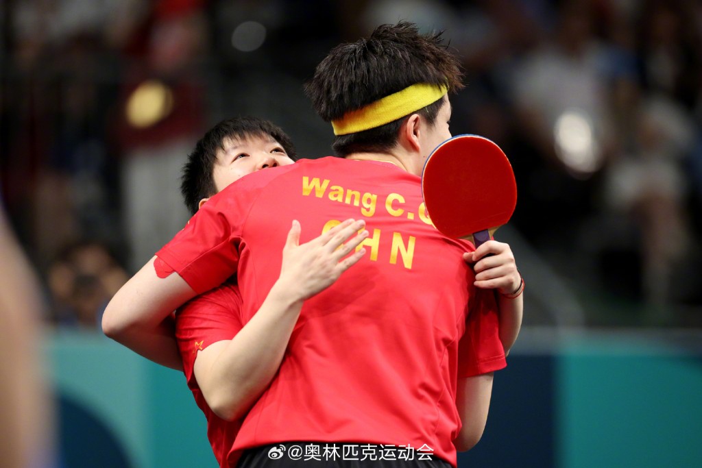 ▲孫穎莎與拍檔王楚欽在乒乓混雙打出好成績,開心抱抱。微博@奧林匹克運動會