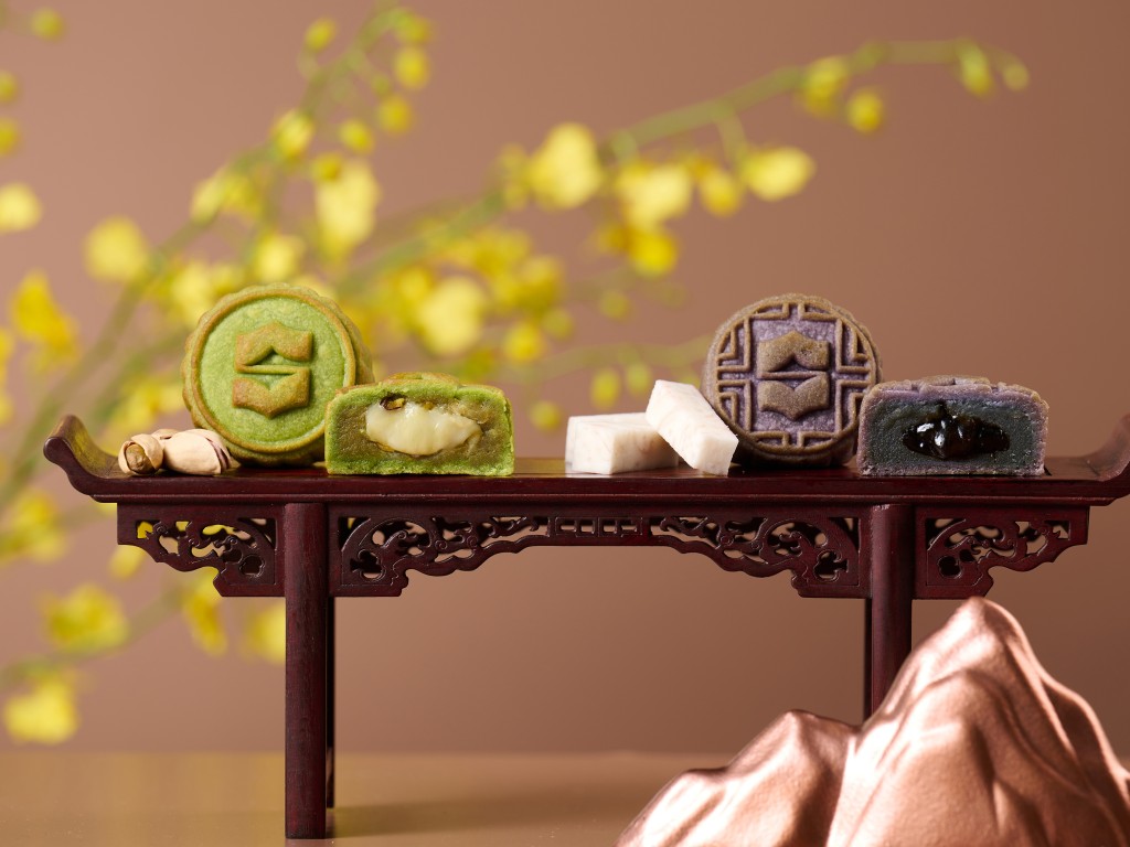 4.芋頭開心果麻糬月餅,香軟粉糯的麻糬分別配搭芳香的芋頭及酥脆的開心果,煙韌富嚼勁,層次鮮明。($408 港島香格里拉酒店)