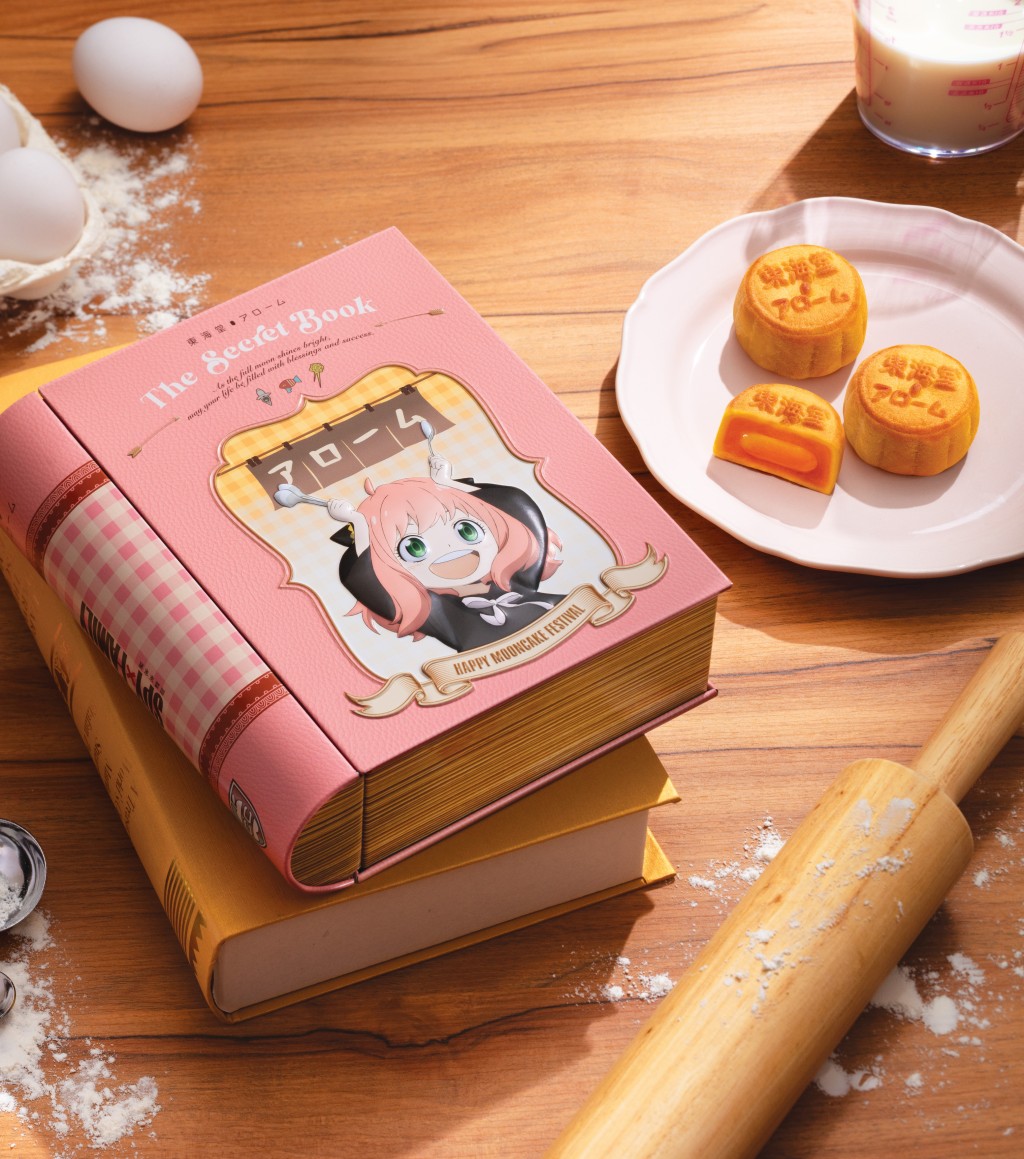 ▲間諜家家酒月餅禮盒,粉紅色皮紋設計的禮盒印有安妮亞,美味的流心奶黃月餅就隱藏在書籍里面。($162 盒 東海堂)