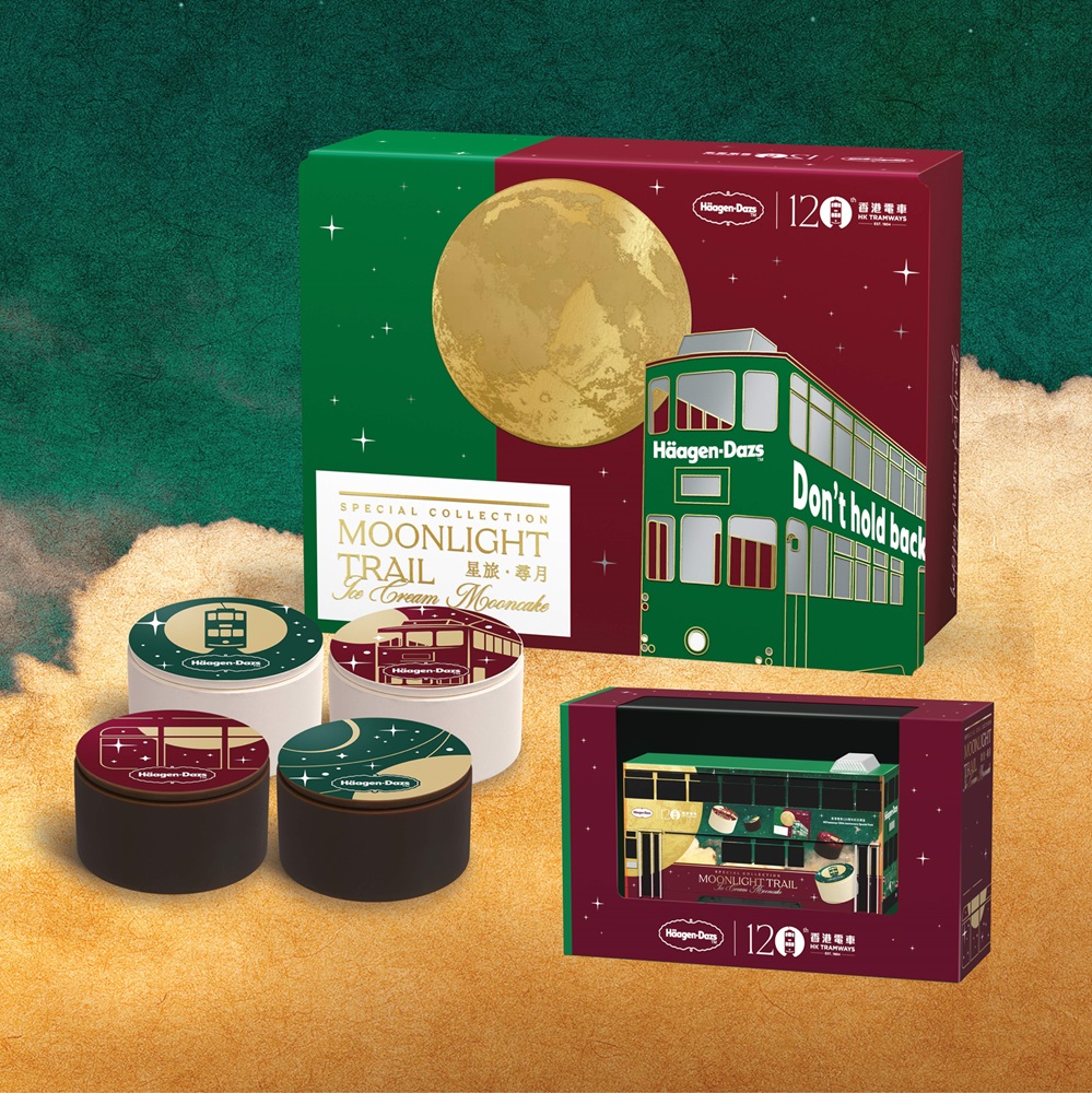 ▲星旅.尋月月餅禮盒,特別版禮盒附送1比120的電車模型,備有士多啤梨、比利時朱古力、云呢嗱及焦糖脆餅雪糕月餅。($438 H?agen-Dazs)