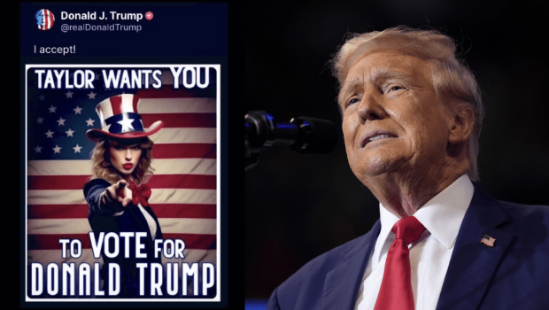 路透社報道,前日(18日),特朗普在社交平臺Truth Social上轉發帖文,只見Taylor Swift戴著一頂象征美國國旗的帽子,打扮成山姆大叔(Uncle Sam)的形象,圖片亦有“Taylor Swift希望你們投票給特朗普”的字句。而特朗普則寫道:“我接受!”