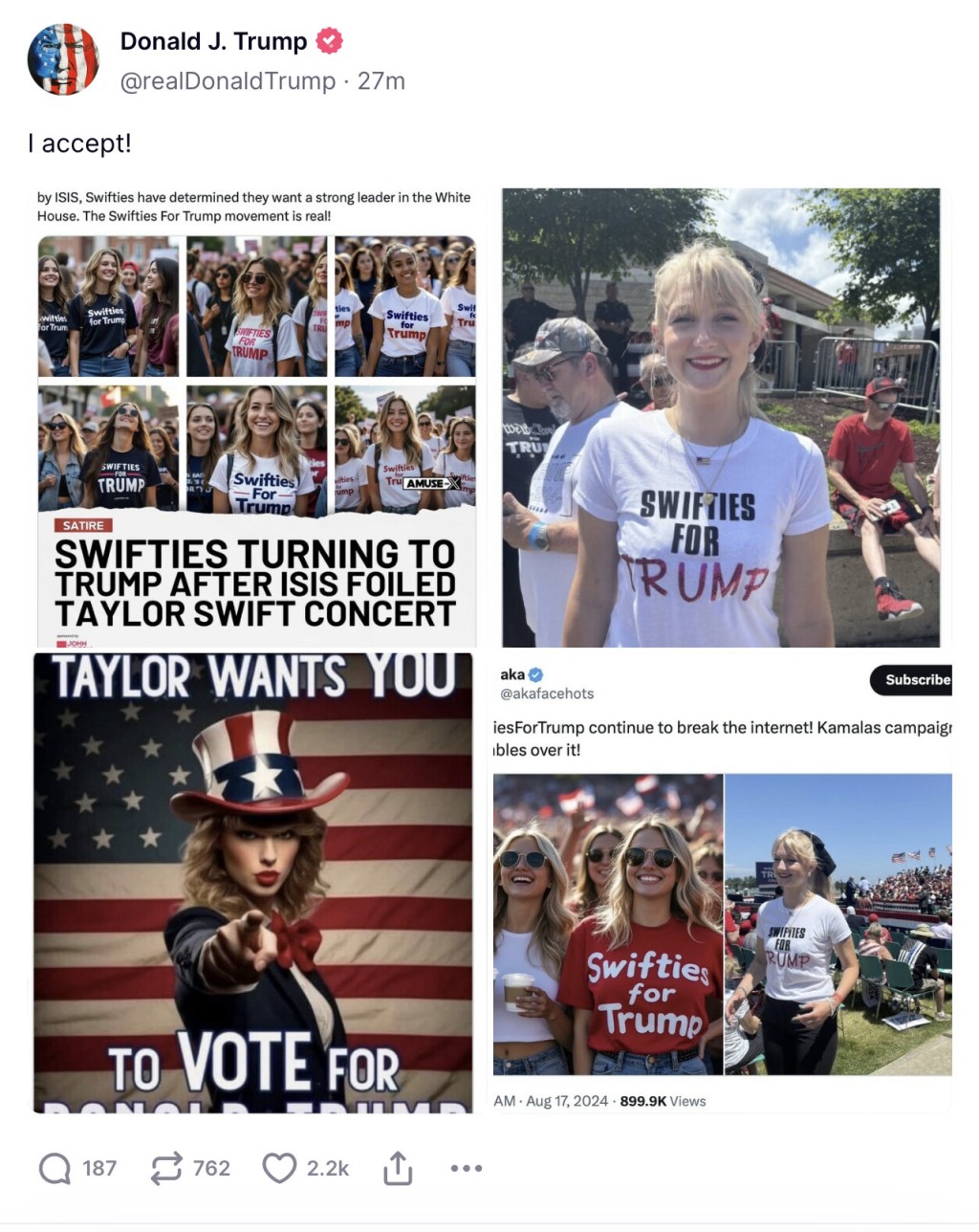 美國大選 | 特朗普轉發AI生成圖片,稱接受Taylor Swift“支持”