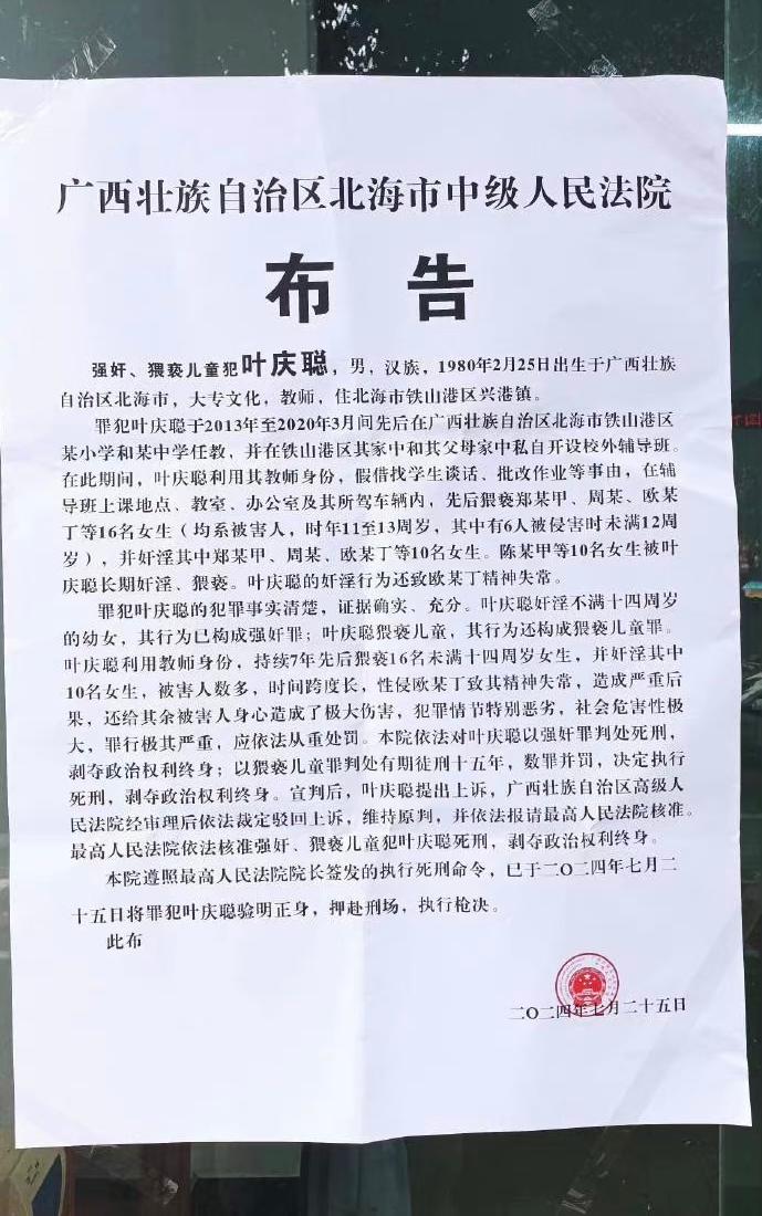 ▲北海市中級人民法院公告,強奸幼女罪犯葉慶聰已被槍決。