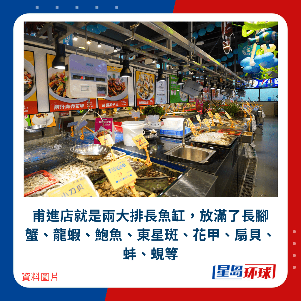 甫進店就是兩大排長魚缸,放滿了長腳蟹、龍蝦、鮑魚、東星斑、花甲、扇貝、蚌、蜆等