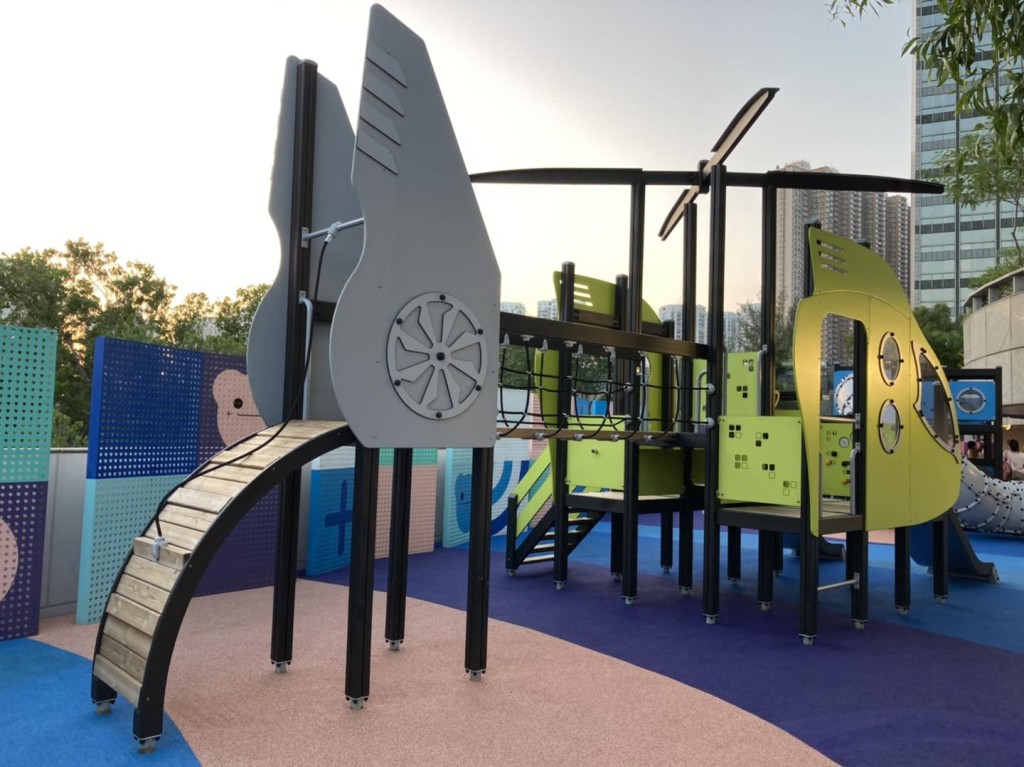 此外還有多條滑梯和獨木橋等,當中有一條滑梯更是直升機造型,既特別又可讓小朋友玩模擬飛行游戲。而最特別的是一個筒型360度旋轉裝置,小朋友要像倉鼠般在內行走,非常過癮。