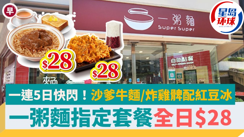 一粥面于8月28日至9月1日推出快閃優惠,一連5日推出“全日$28套餐”,指定3款早餐、午餐、下午茶套餐均以優惠價$28發售,早餐有沙爹牛肉即食面配牛油厚多士及茶或咖啡、午餐為臺式熏蛋鹵肉飯,而下午茶則會供應土匪七味炸無骨雞腿配紅豆冰!