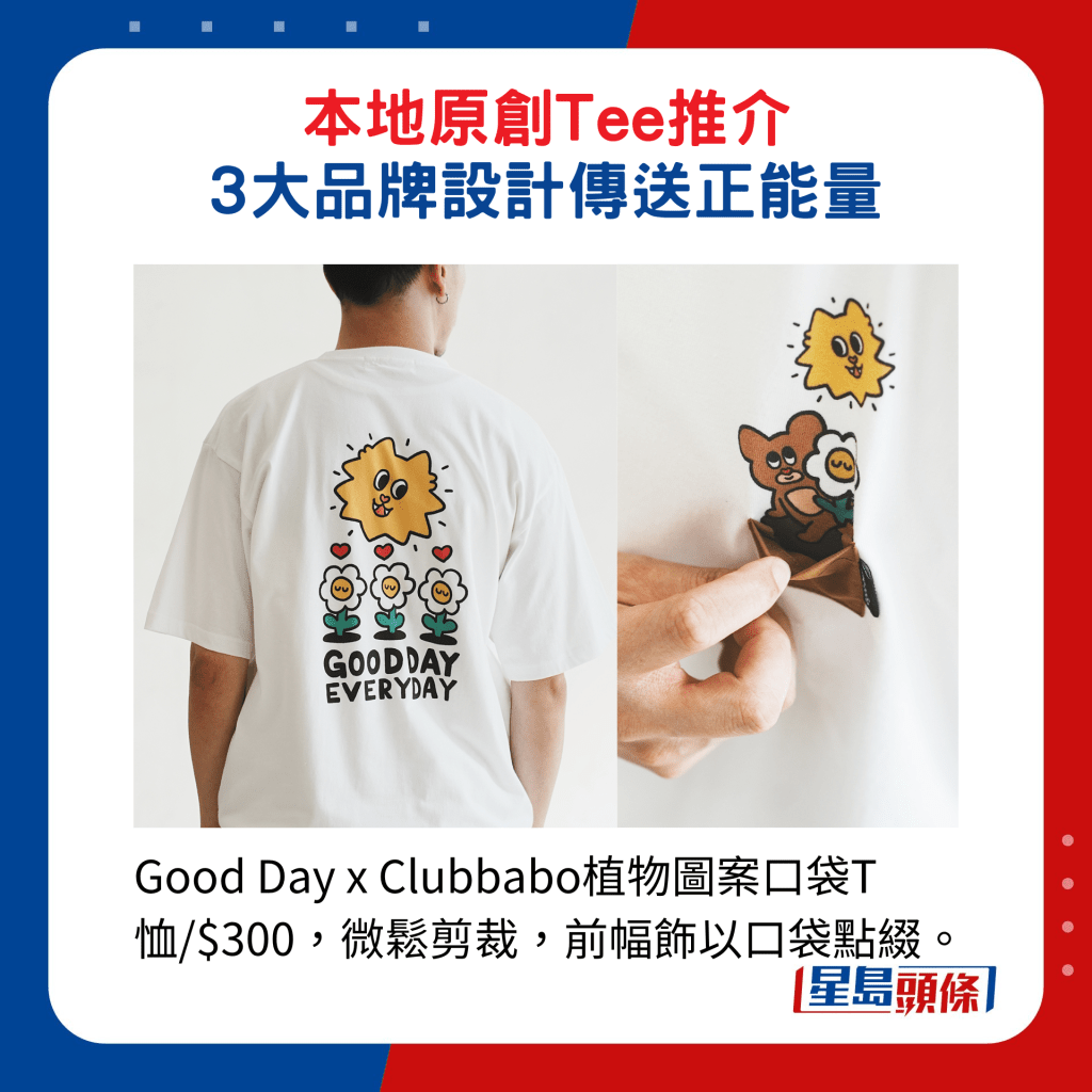 Good Day x Clubbabo植物圖案口袋T恤$300,微松剪裁,前幅飾以口袋點綴。