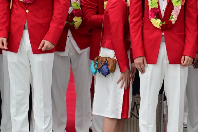 巴黎奧運國家隊代表團今午(29日)抵達香港,展開3天訪問行程,特區政府在停機坪舉辦歡迎儀式,運動員由乒乓球運動員馬龍領頭下機,拿下兩面金牌的17歲跳水運動員全紅嬋緊隨其后。全紅嬋一身輕便,斜揹Miu Miu手袋,掛有兩只烏龜吊飾,雖然北京來港“機程”僅約3小時,但全妹一臉倦容,甫下機即打呵欠。最后大合照,司儀讓大家鼓掌,只有全紅嬋“蝦碌”揮手,十分可愛。
