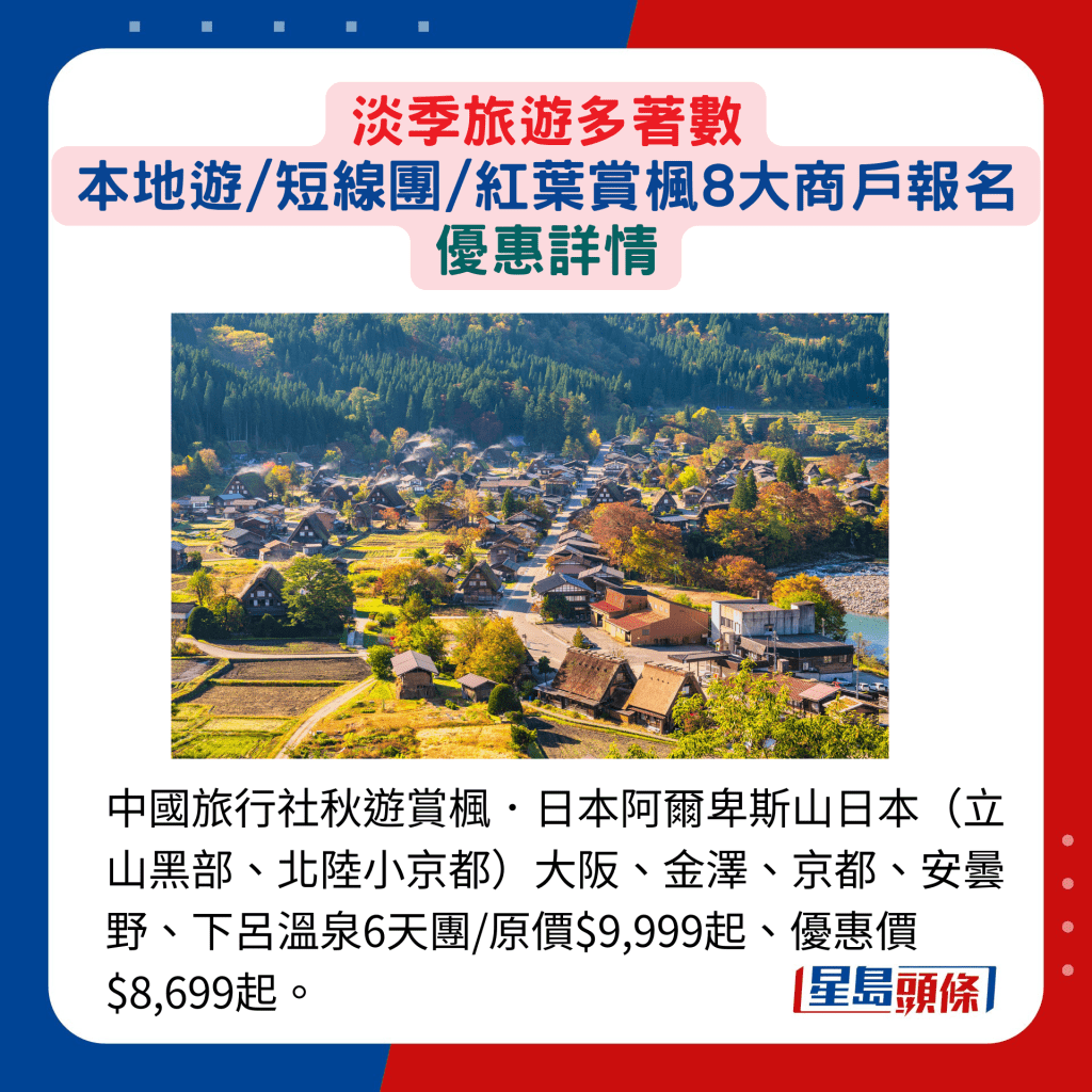 中國旅行社秋游賞楓.日本阿爾卑斯山日本(立山黑部、北陸小京都)大阪、金澤、京都、安曇野、