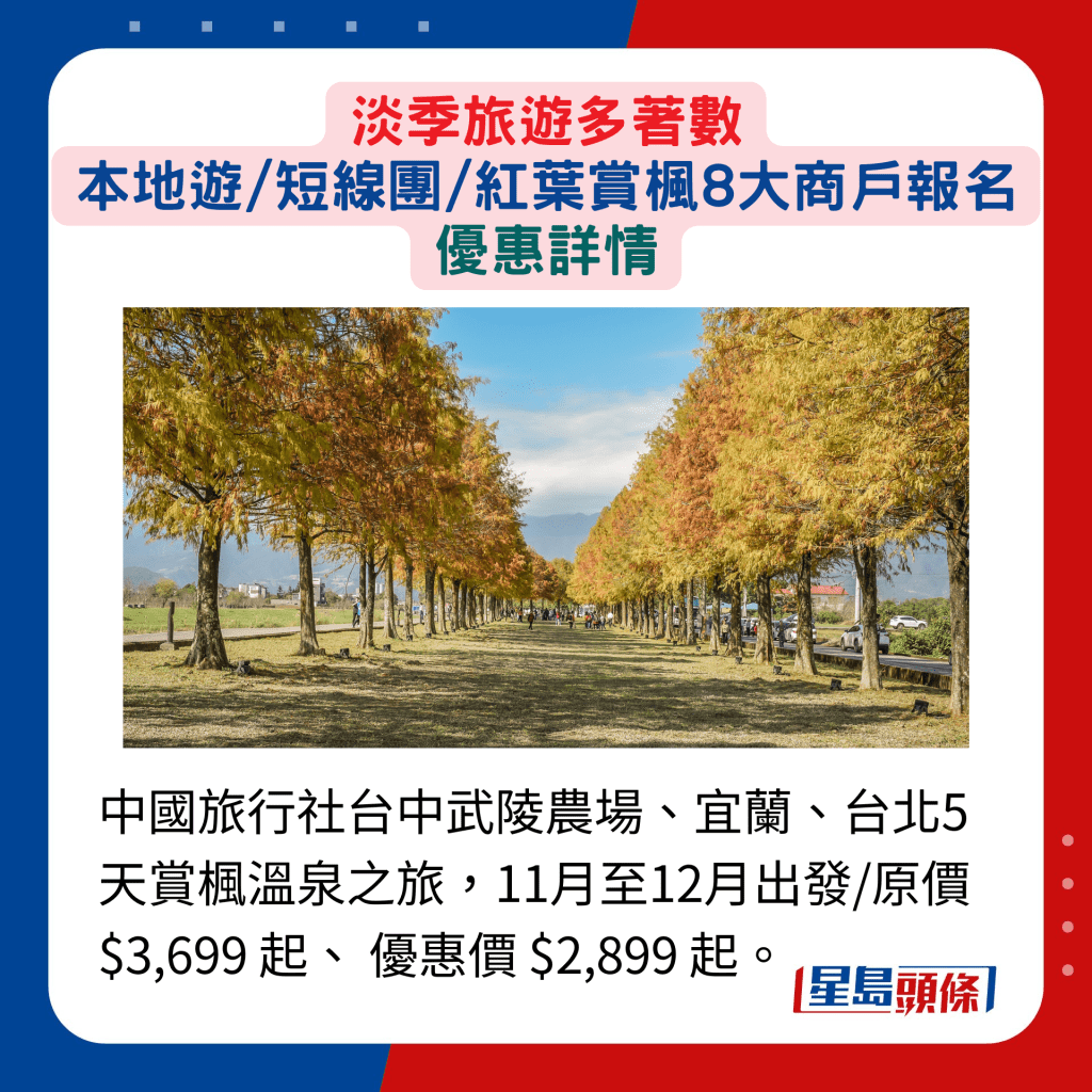 中國旅行社臺中武陵農場、宜蘭、臺北5天賞楓溫泉之旅
