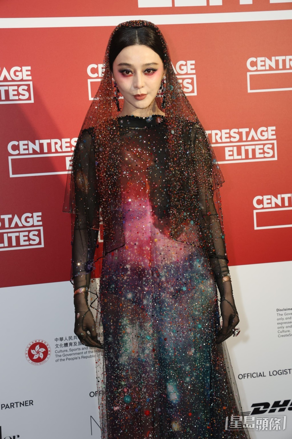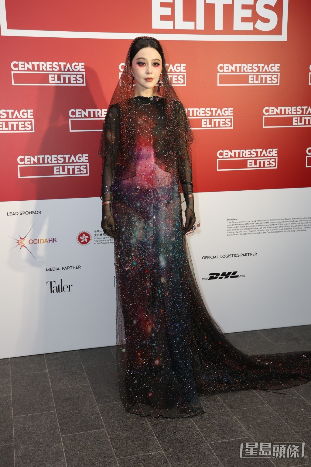 范冰冰身穿設計師云惟駿打造的一條以宇宙星體設計的透視拖尾紗裙現身。