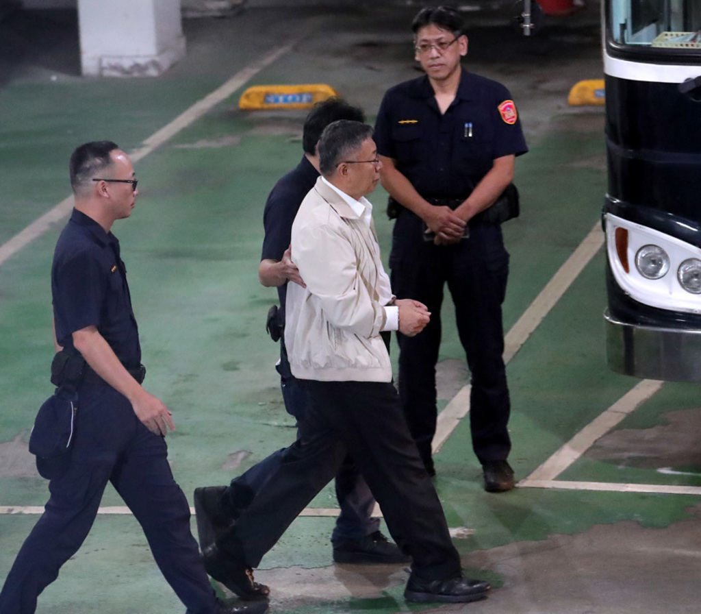 ▲前臺北市長柯文哲(穿白衣者)約于5日下午5時50分,被上銬押上囚車,移送臺北看守所。中時資料照