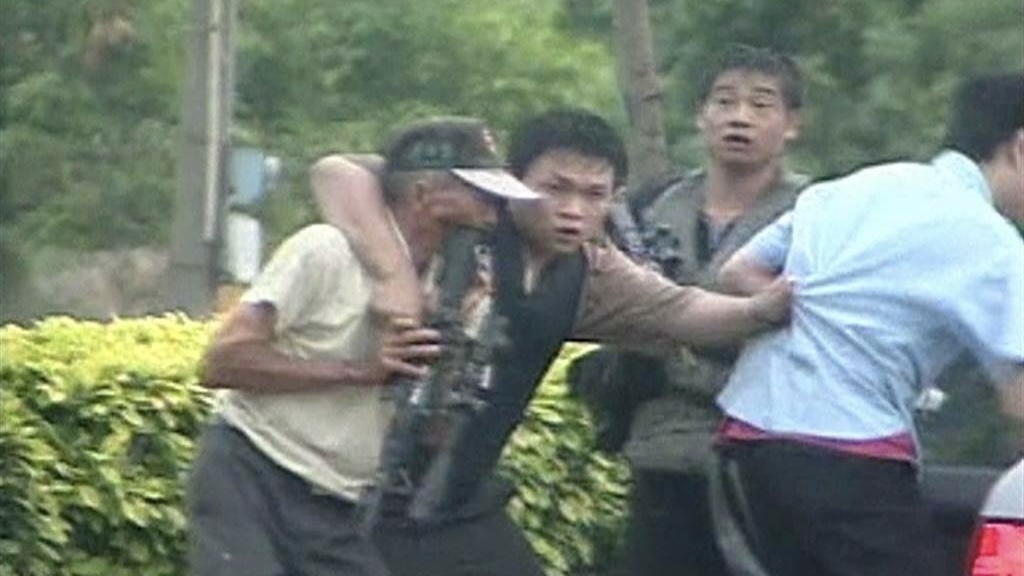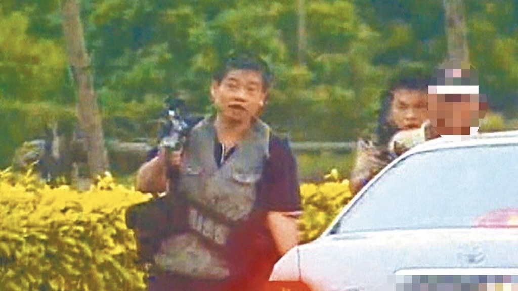 “臺灣張子強”張錫銘(左一)2004年與同伙被圍捕時挾持1名老農(右一)和警察街頭槍戰。