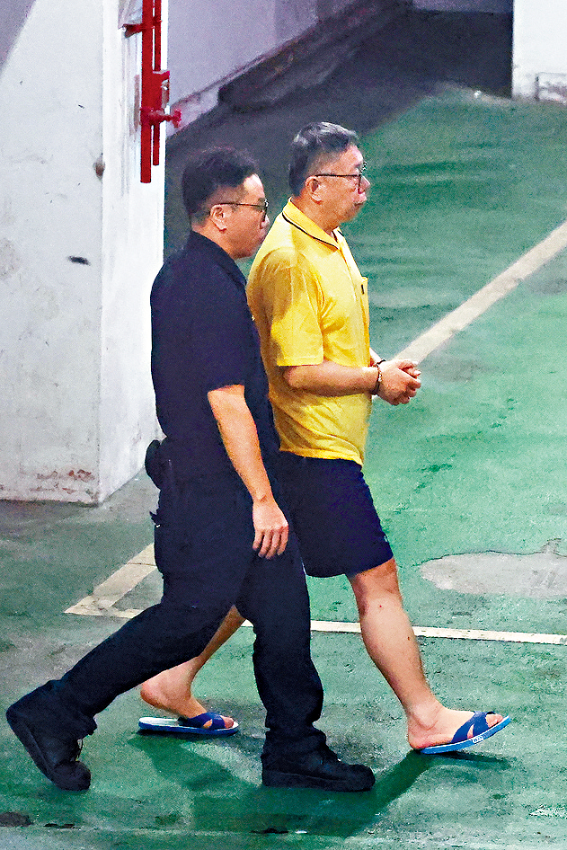 ▲柯文哲被扣押,身穿短褲,雙手上銬。