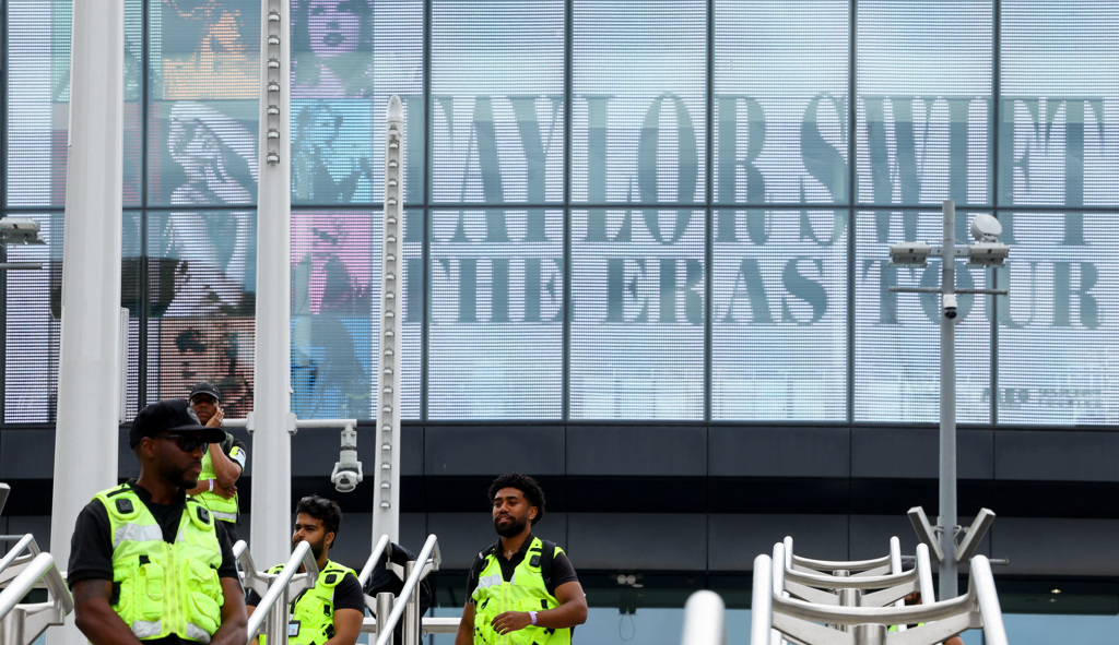 ▲泰勒·斯威夫特今年巡回全球舉辦“時代巡回演唱會”。圖為8月15日倫敦演唱會入口主視覺。 路透