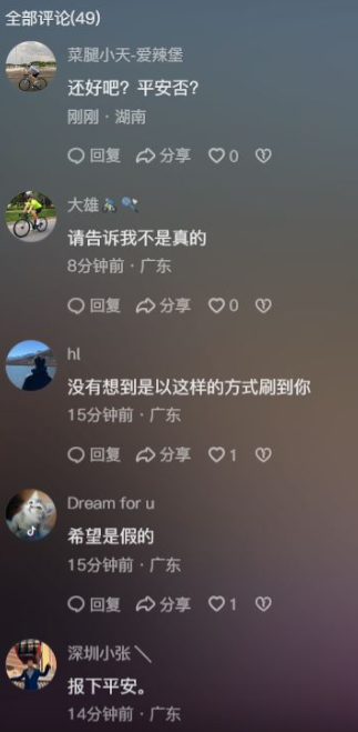 消息流出后,不少內地網民透過涌到其抖音最新片段留言,紛紛希望她報平安,“請告訴我不是真的”、“希望是假的”、“海莉子,報下平安”、“還在嗎”,令人惋惜。