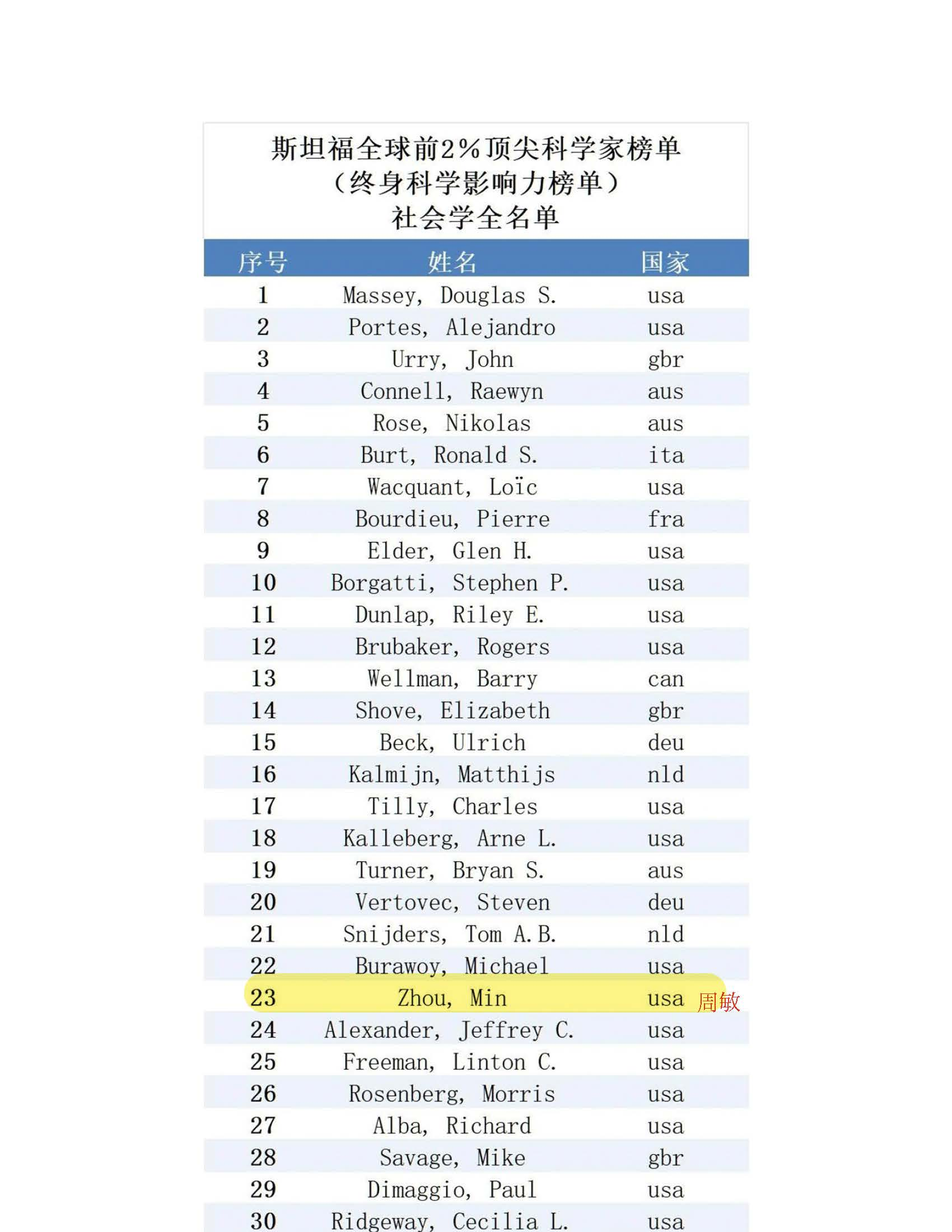 美籍華人社會學學者、美國洛杉磯加州大學(UCLA)周敏博士名列第23位,為華人社會學家的榜首。
