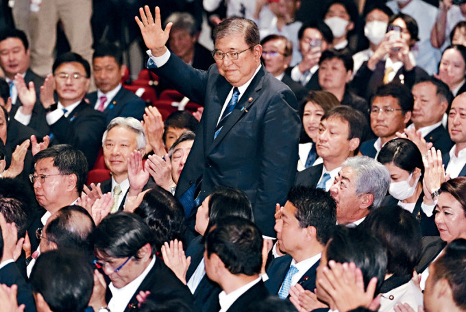 ▲石破茂周五當選自民黨總裁后向支持者揮手致意。