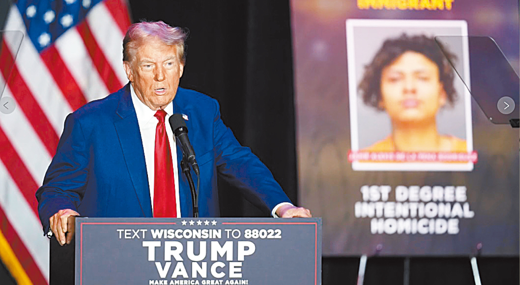 特朗普出席演講時,指責賀錦麗令國家的邊界蕩然無存,需為非法移民犯罪急增的現象負責。 美聯社