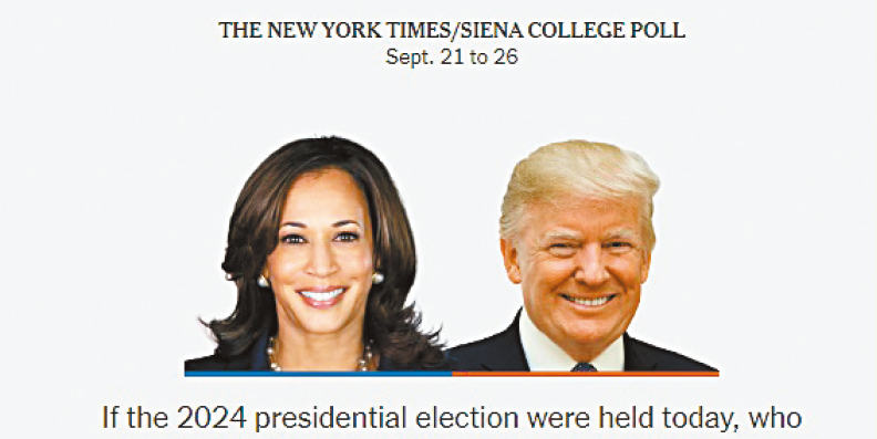 《紐約時報》與錫耶納學院聯合調查發現,哈里斯在密州支持度領先特朗普1個百分點。 紐約時報
