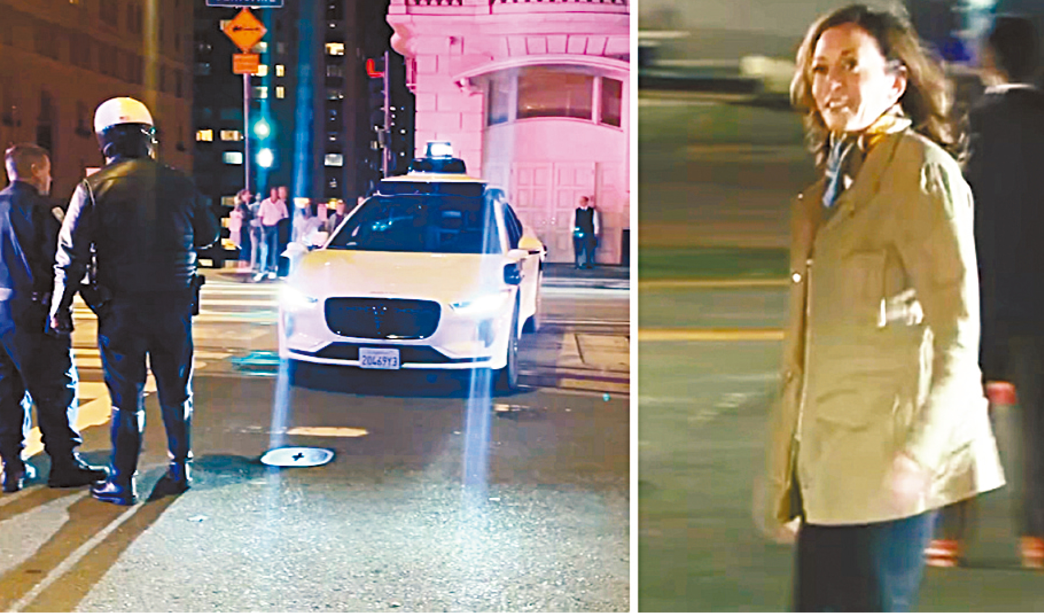 ▲副總統哈里斯周五晚抵達舊金山,車隊一度被一輛Waymo無人車阻擋去路。ABC7電視畫面
