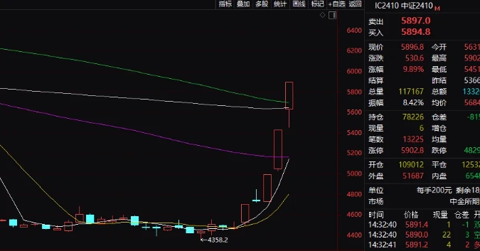 在A股市場大幅度上行之際,相關股指期貨也暴漲,其中中證2410期貨合約、滬深2410等多份股指期貨合約漲幅達到10%,觸及漲停。