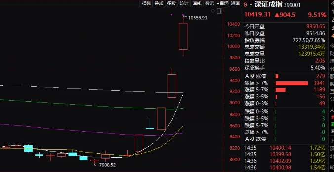 深證成指盤中漲幅一度超過10%。創出本世紀以來最大盤中漲幅紀錄。