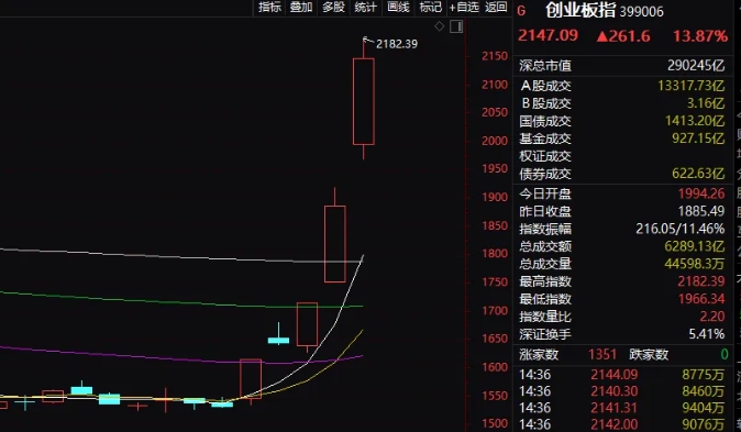 創業板指數盤中漲幅一度超過15%,創出歷史最大盤中漲幅紀錄。