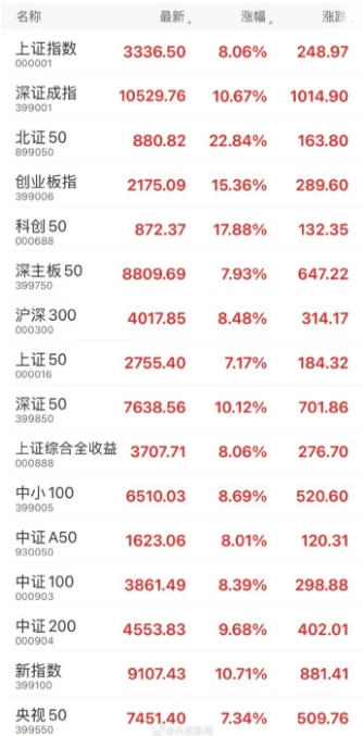 據央視新聞報道,截至2024年9月30日收盤:上證指數(000001)漲8.06%站穩3300點,深證成指(399001)漲10.67%,創業板指(399006)漲15.36%,科創50、北證50指數均收漲逾15%,同步刷新歷史最好成績。近40只行業ETF漲停,超3000股漲幅超9%。A股全天成交超2.6萬億元,創歷史新高。