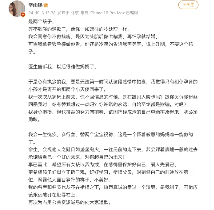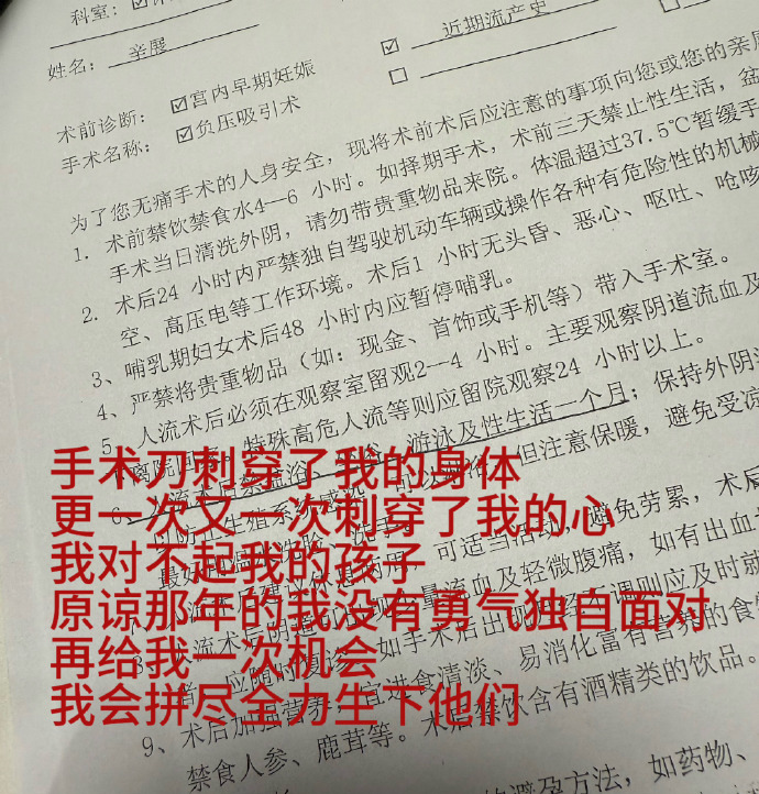 辛雨錫發了千字文,更貼出流產手術的證據,并寫上:“手術刀刺穿了我的身體,更一次又一次刺穿了我的心,我對不起我的孩子,原諒那年的我沒有勇氣獨自面對,再給我一次機會,我會拼盡全存生下他們?!?而另一張超聲波上,辛雨錫又寫上:“背叛我的日日夜夜,想起兩個孩子你能安枕無憂嗎? 他們會幫著媽媽一直盯著你,誓言蒼白可我相信舉頭三尺有神明,天理昭昭必有報應。