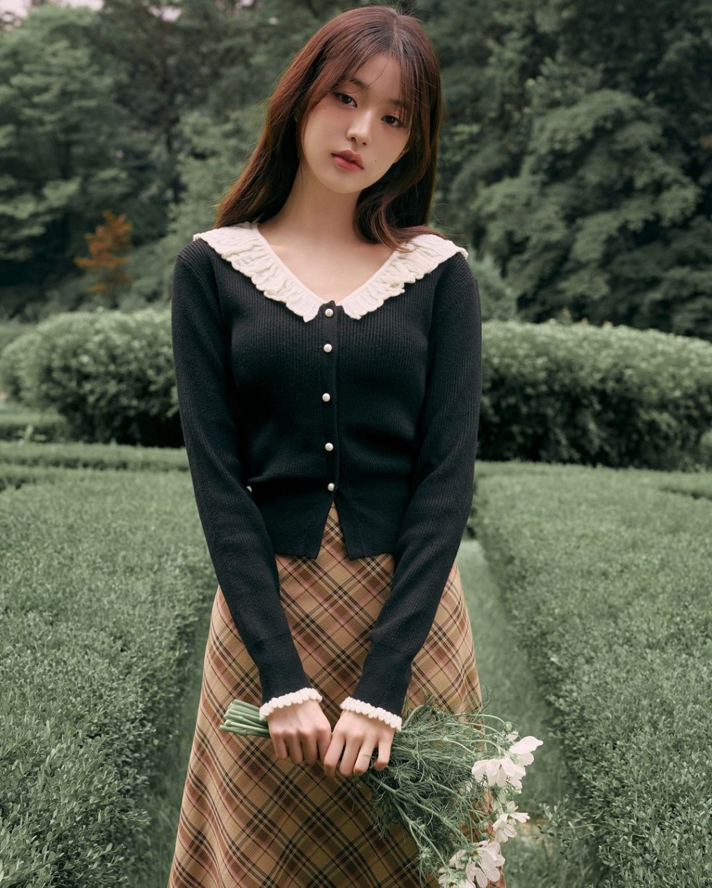 韓國女團IVE成員張員瑛Rufles細節針織外套,配搭格紋半截裙,塑造典雅淑女形象。(圖片來源:1G@for_everyyoung 10)