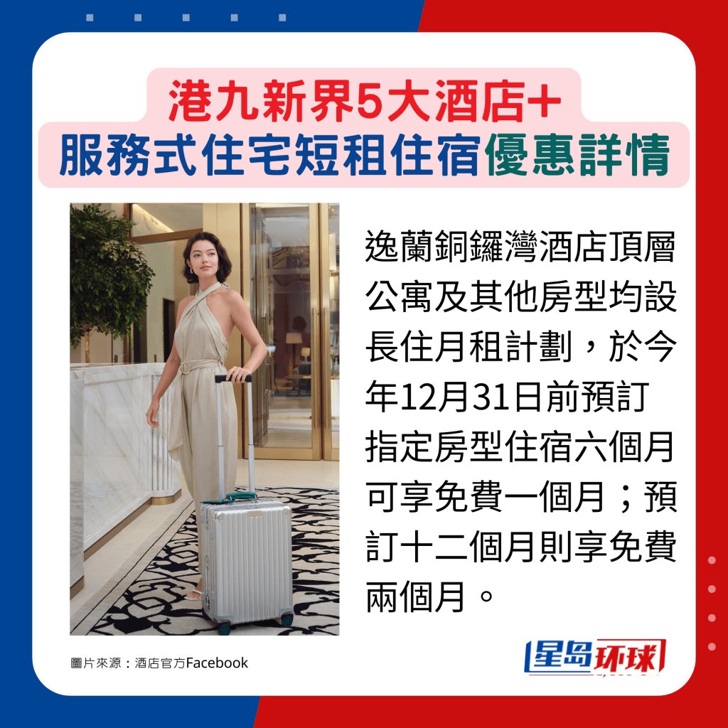 逸蘭銅鑼灣酒店頂層公寓及其他房型均設長住月租計劃,于今年12月31日前預訂指定房型住宿六個月可享免費一個月;預訂十二個月則享免費兩個月。