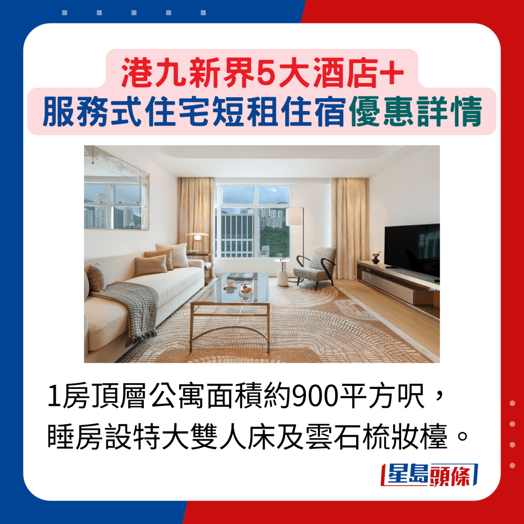 位于尖東的富豪九龍酒店亦有提供連續入住7晚、14晚及30晚的短租選擇,若挑選豪華客房或以上房型,均可免費獲每日"Grab & Go"咖啡或茶及2塊糕點,以及體驗健康活動等。若入住家庭客房(高級豪華客房)或以上房型連續兩個月享9折,連續三個月則享85折,換言之,住宿時間越長越抵??! 同樣位于尖沙咀的服務式住宅港威豪庭,提供712平方呎的開放式單位,以至2,931平方呎的3房頂層特色單位,每個單位均由指定房務員管理,確保私隱度,亦提供每日打掃服務 (星期日及公眾假期除外)。住客更可享海港城city'super專屬優惠,最適合愛購物一族。