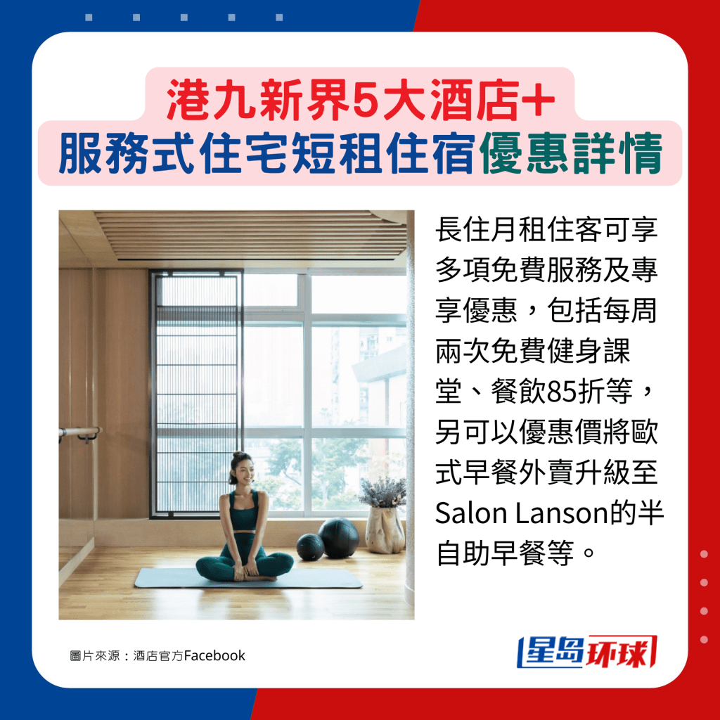 長住月租住客可享多項免費服務及專享優惠,包括每周兩次免費健身課堂、餐飲85折等,另可以優惠價將歐式早餐外賣升級至Salon Lanson的半自助早餐等。