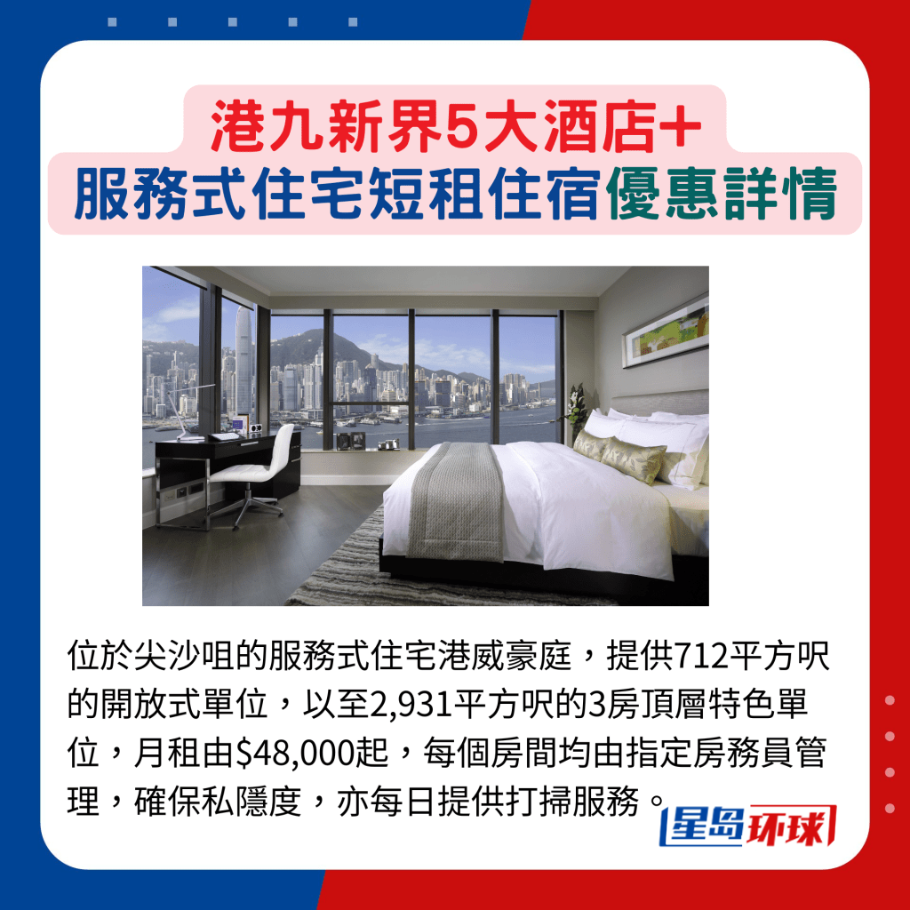 位于尖沙咀的服務式住宅港威豪庭,提供712平方呎的開放式單位,以至2,931平方呎的3房頂層特色單位,月租由$48,000起,每個房間均由指定房務員管理,確保私隱度,亦每日提供打掃服務。