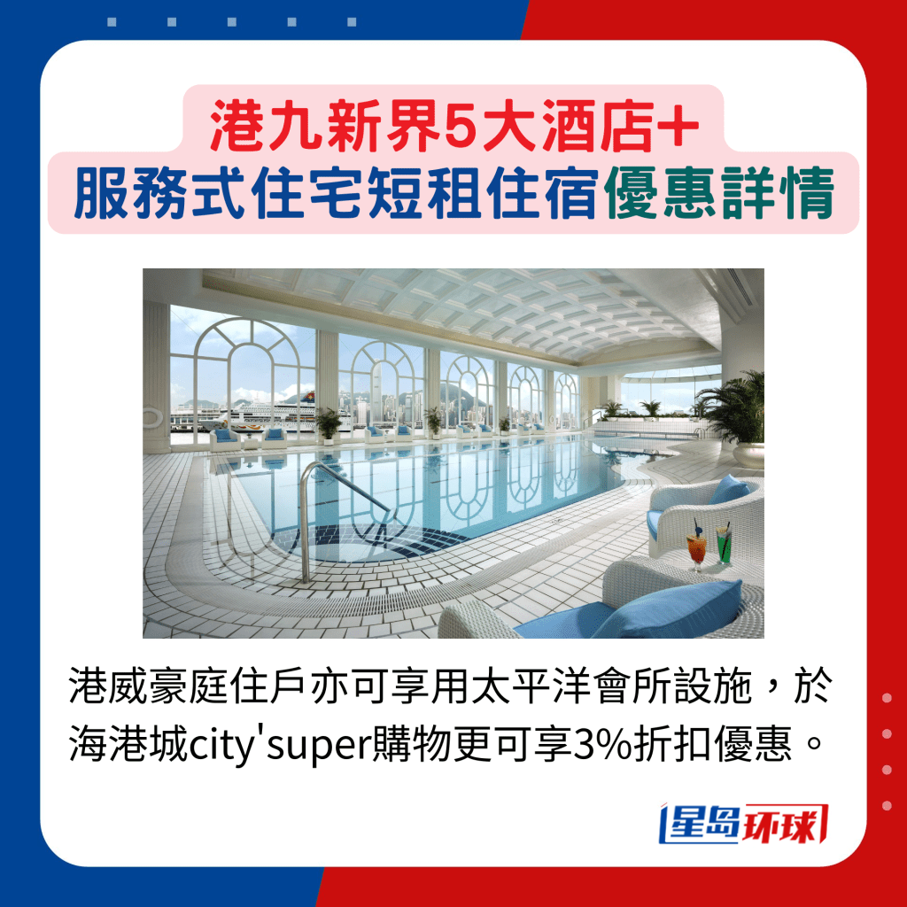 港威豪庭住戶亦可享用太平洋會所設施,于海港城city'super購物更可享3%折扣優惠。